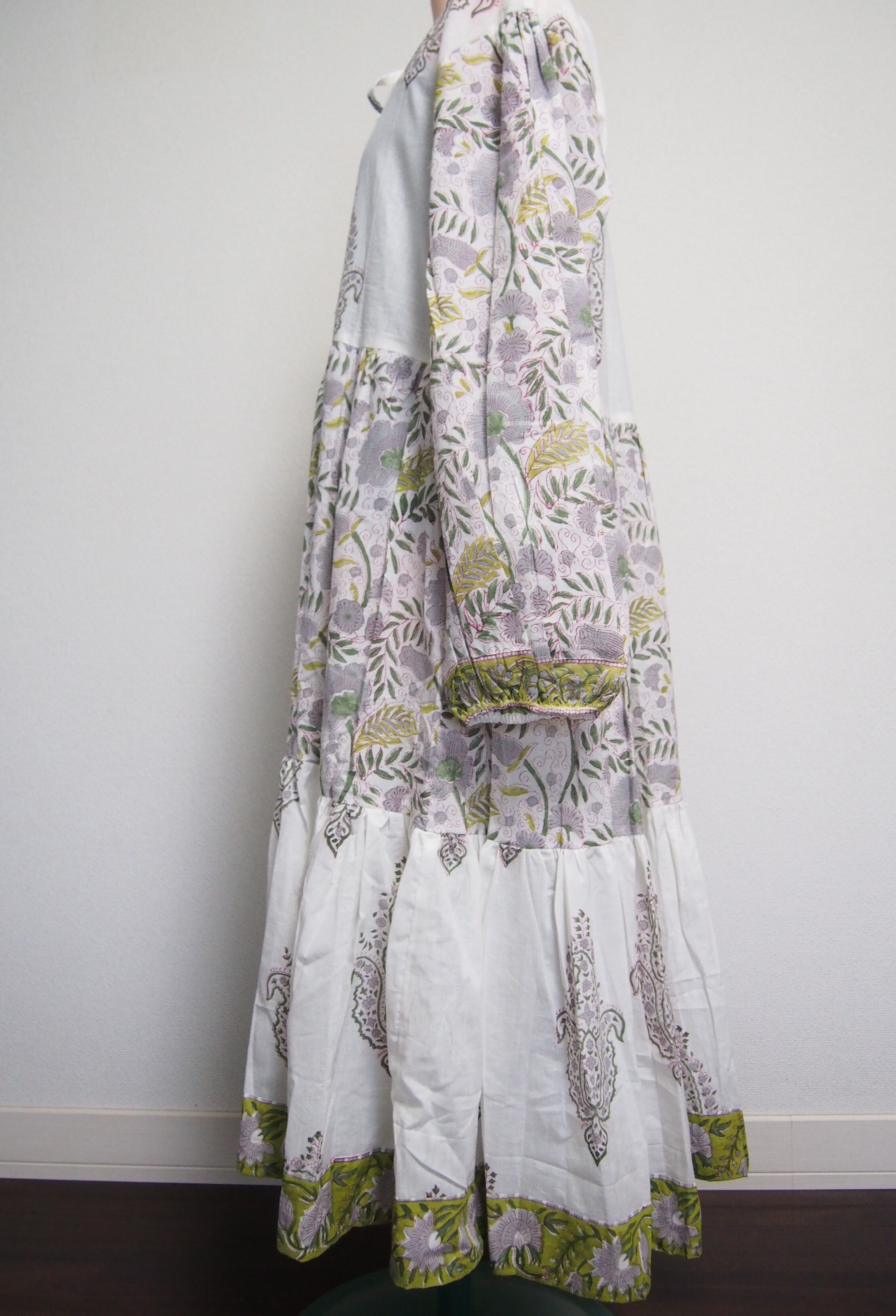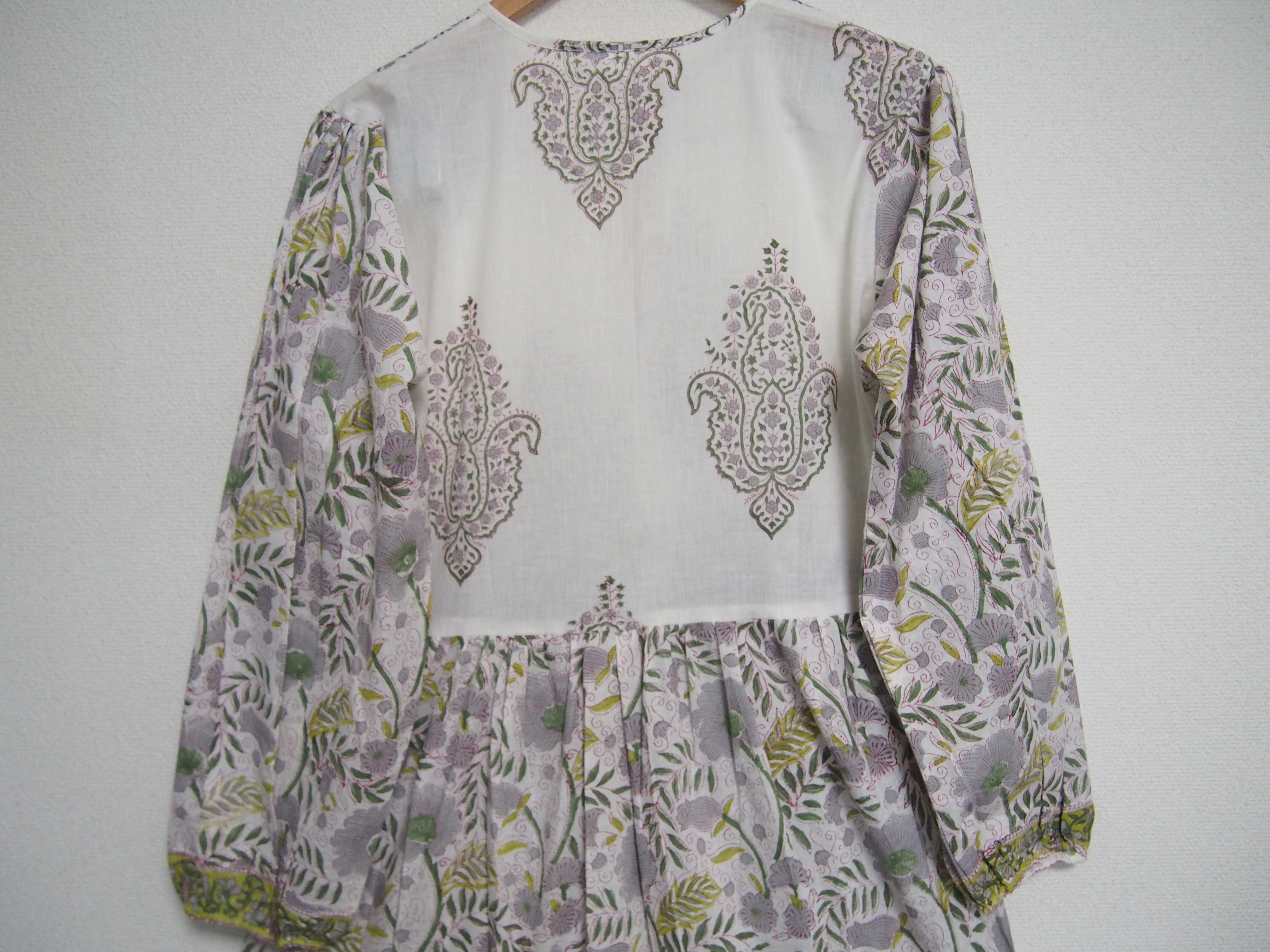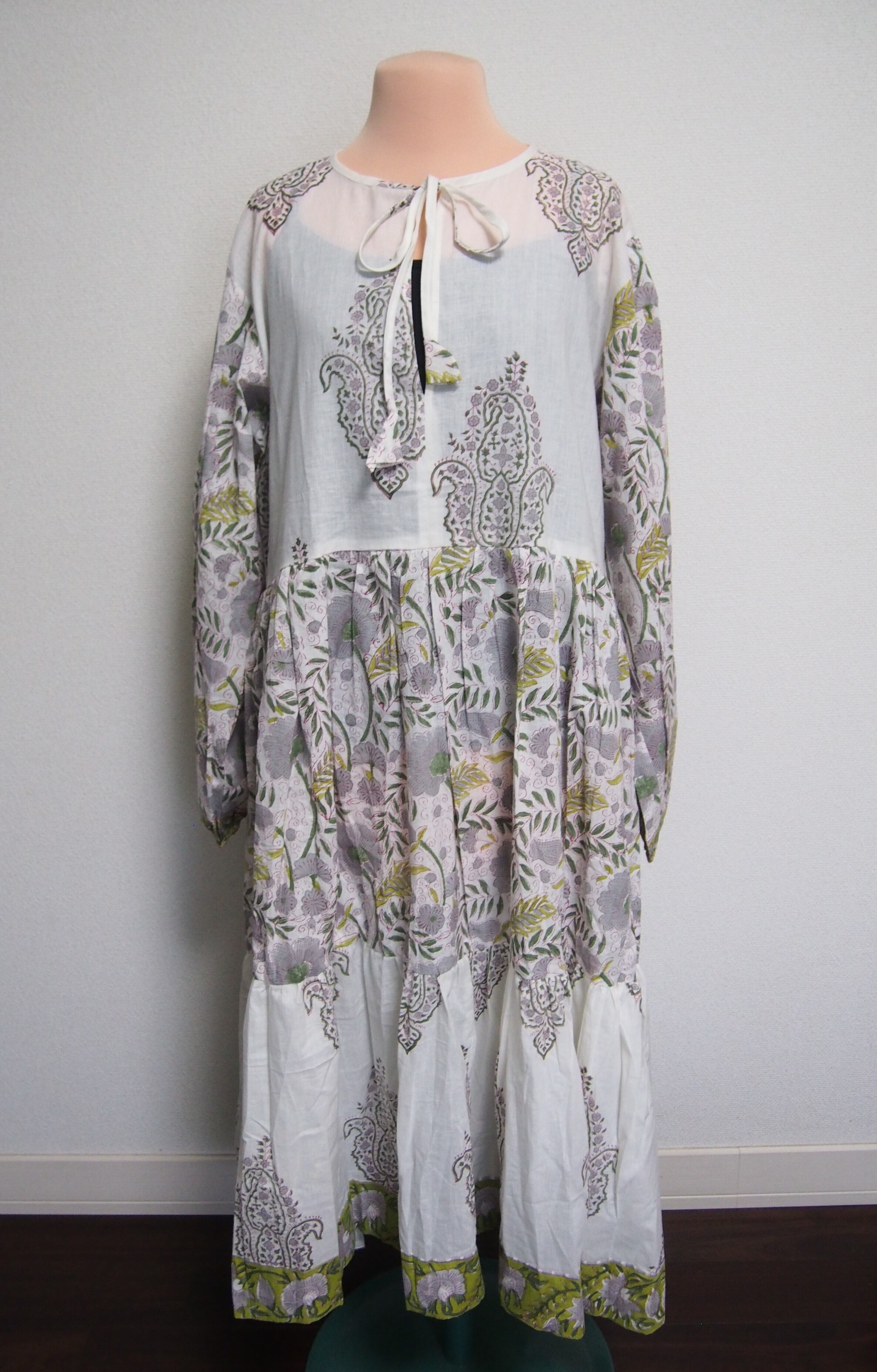 インドの伝統工芸であるハンドブロックプリントで作られたワンピースです。