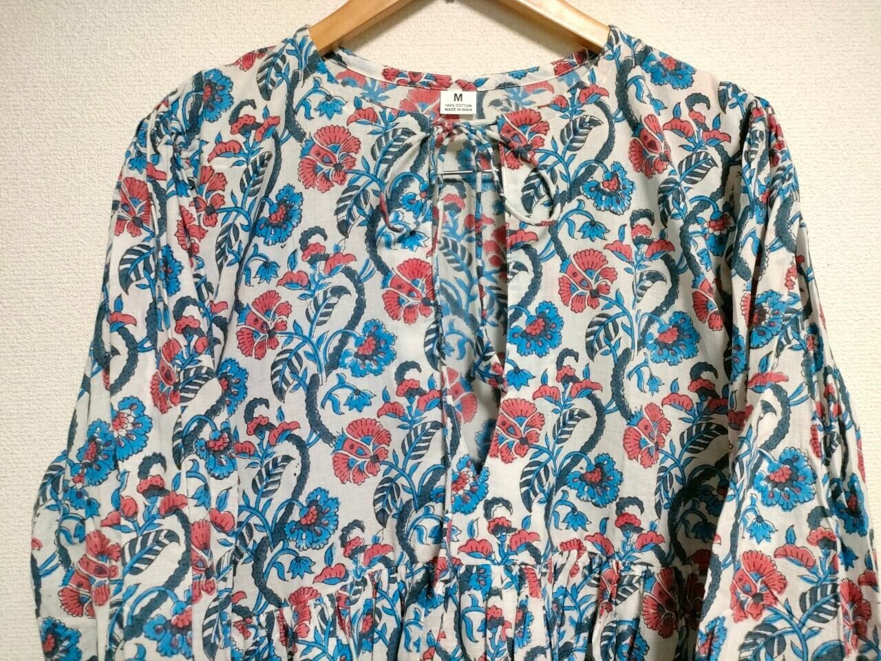 インドの伝統工芸であるハンドブロックプリントで作られたワンピースです。