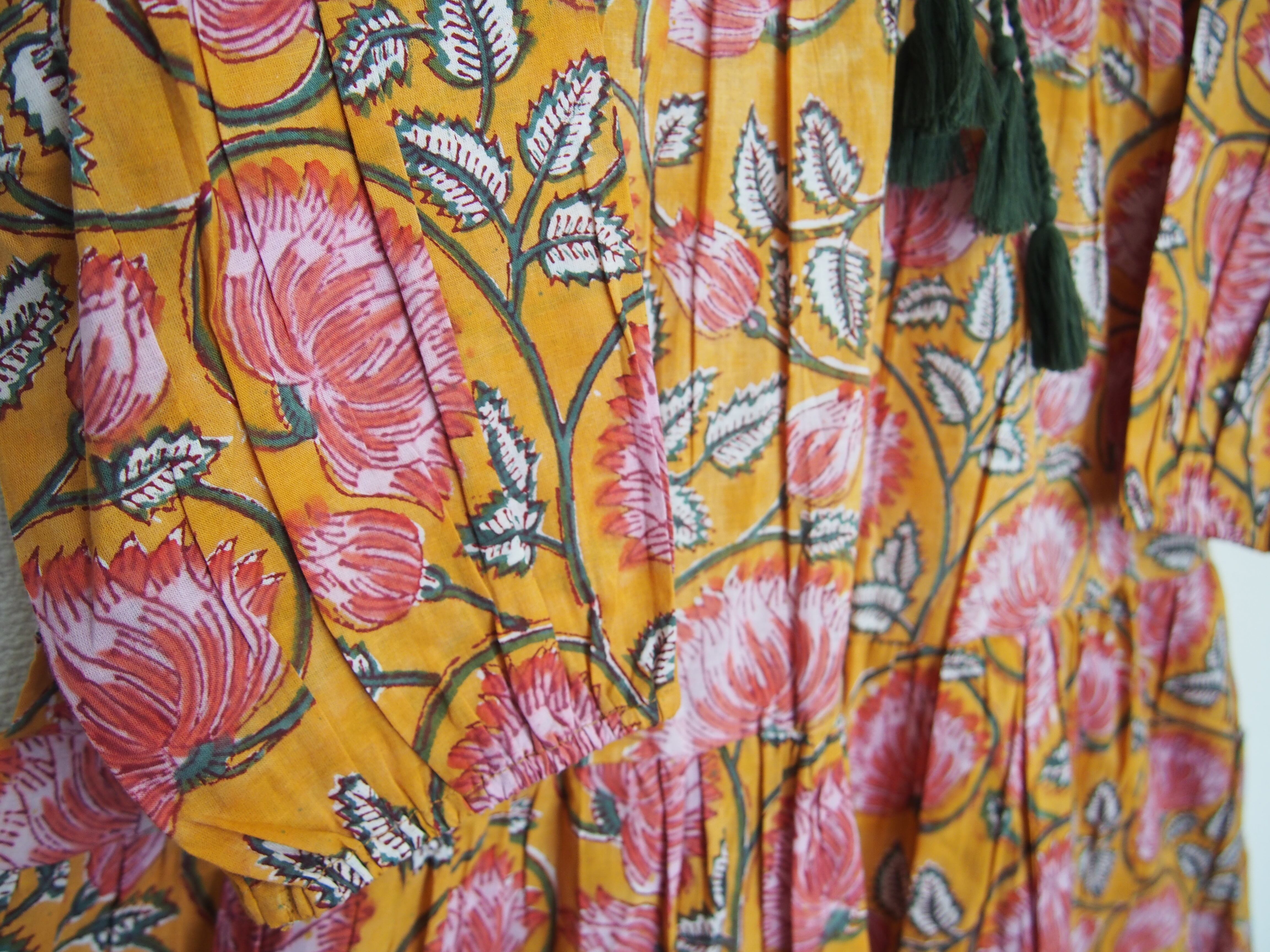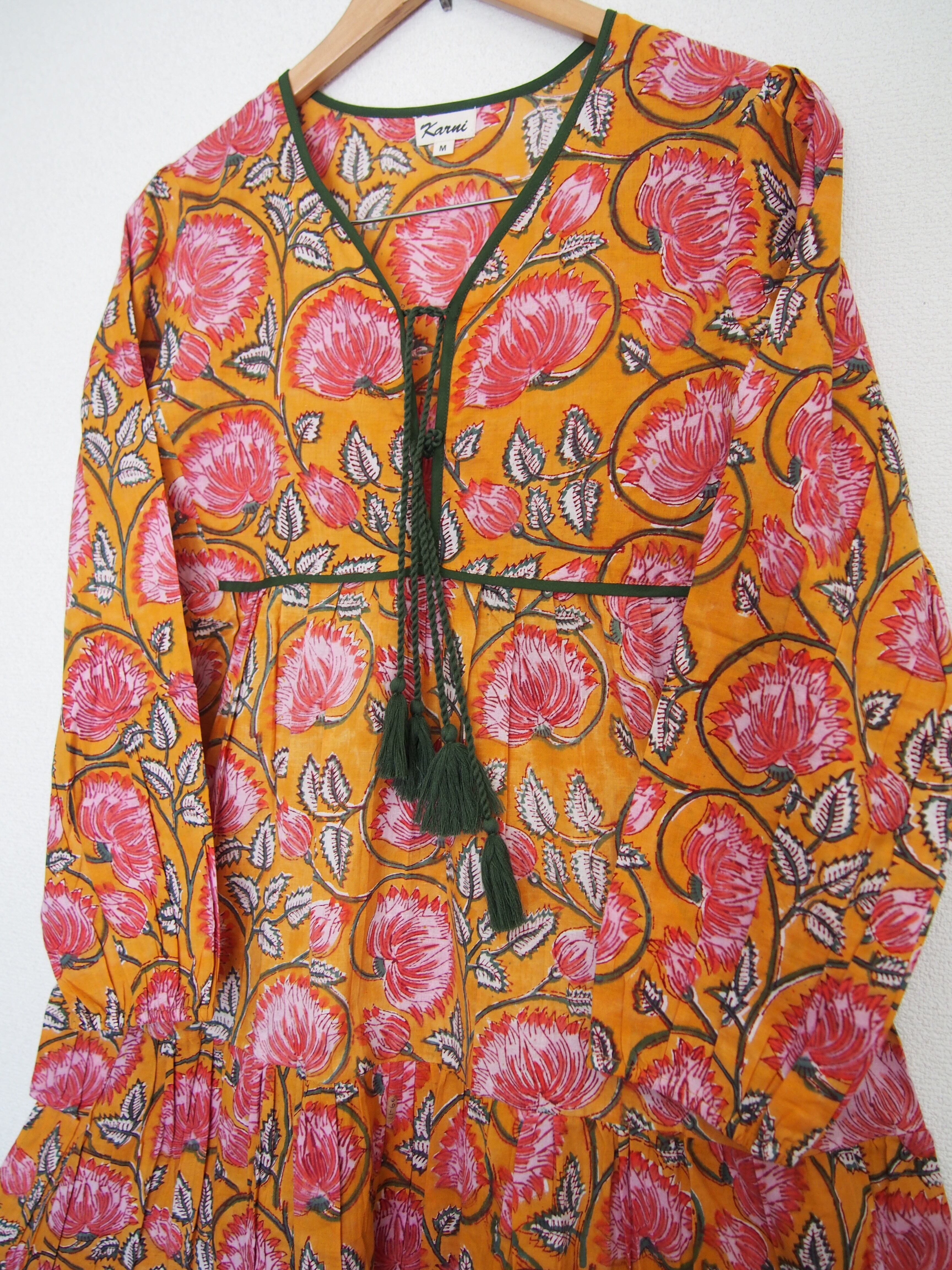 インドの伝統工芸であるハンドブロックプリントで作られたワンピースです。