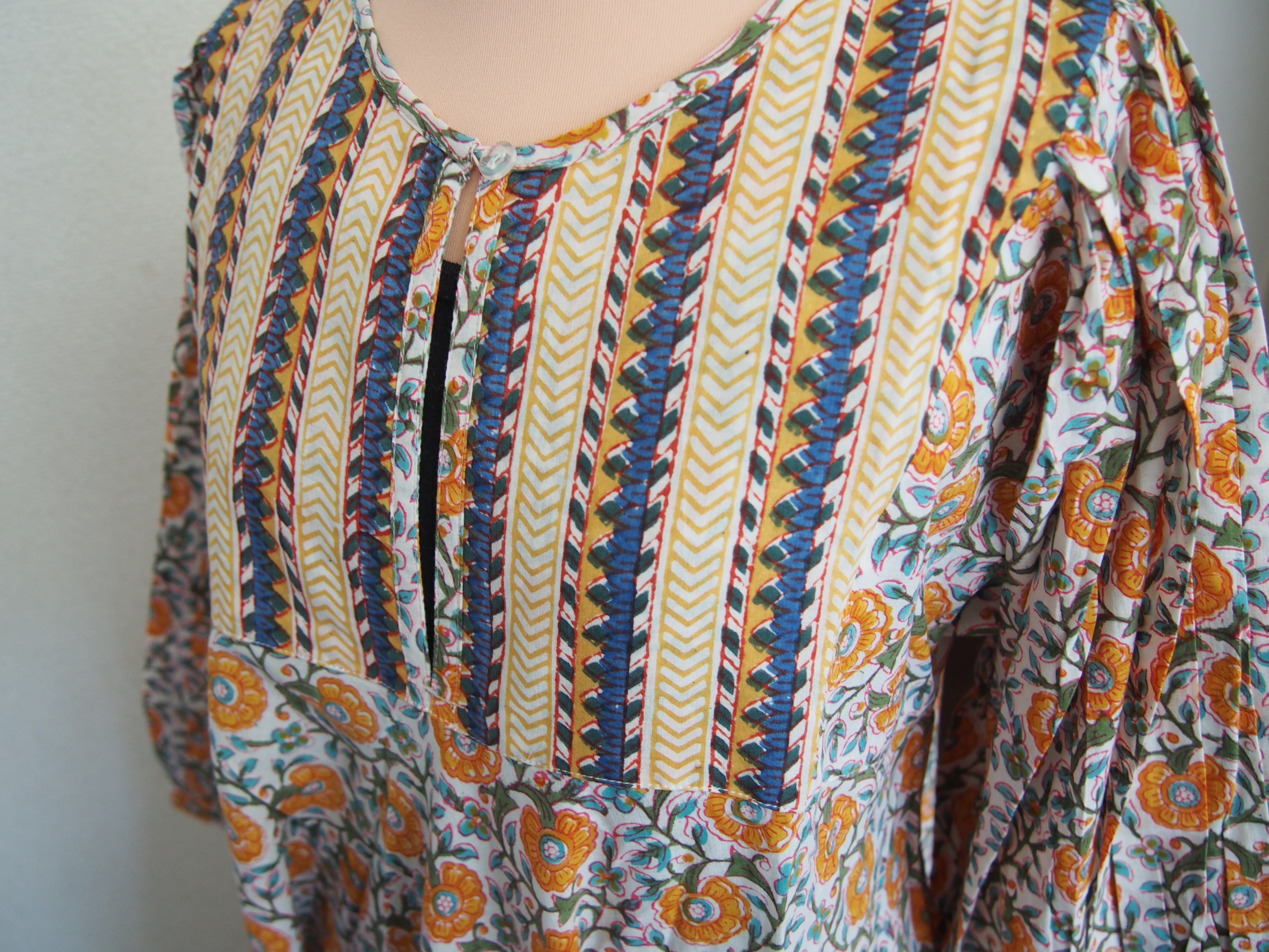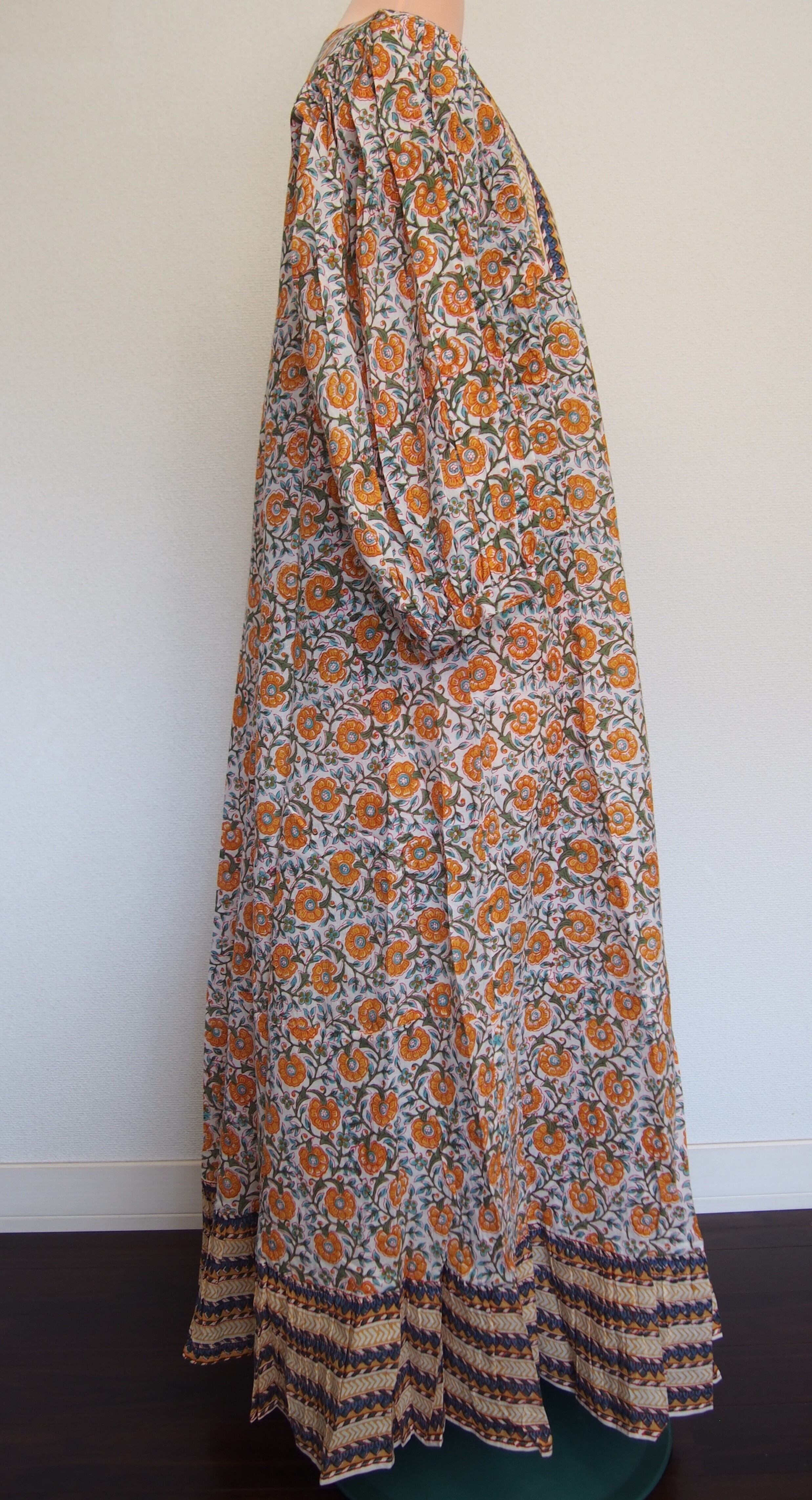 インドの伝統工芸であるハンドブロックプリントで作られたワンピースです。