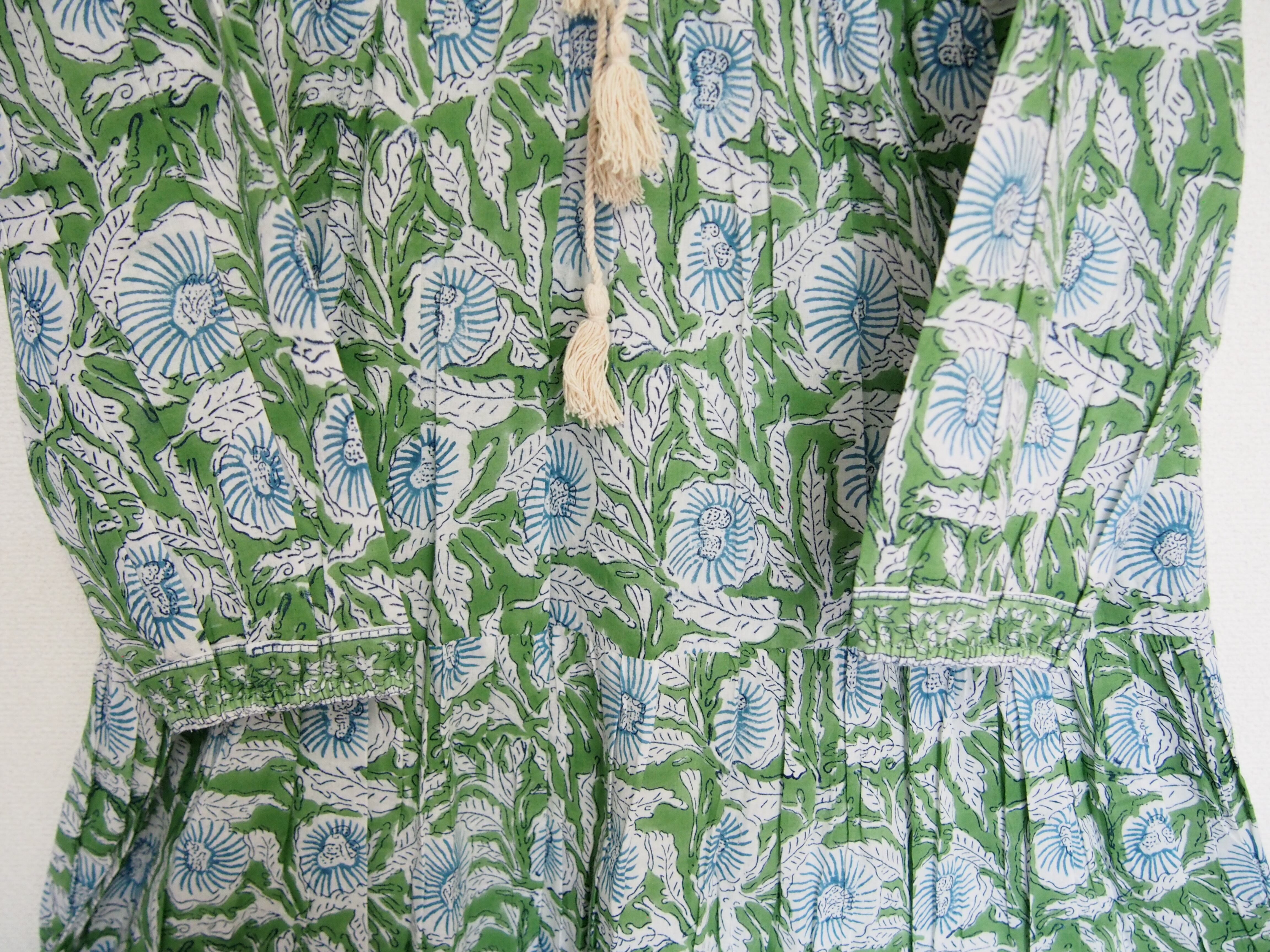 インドの伝統工芸であるハンドブロックプリントで作られたワンピースです。