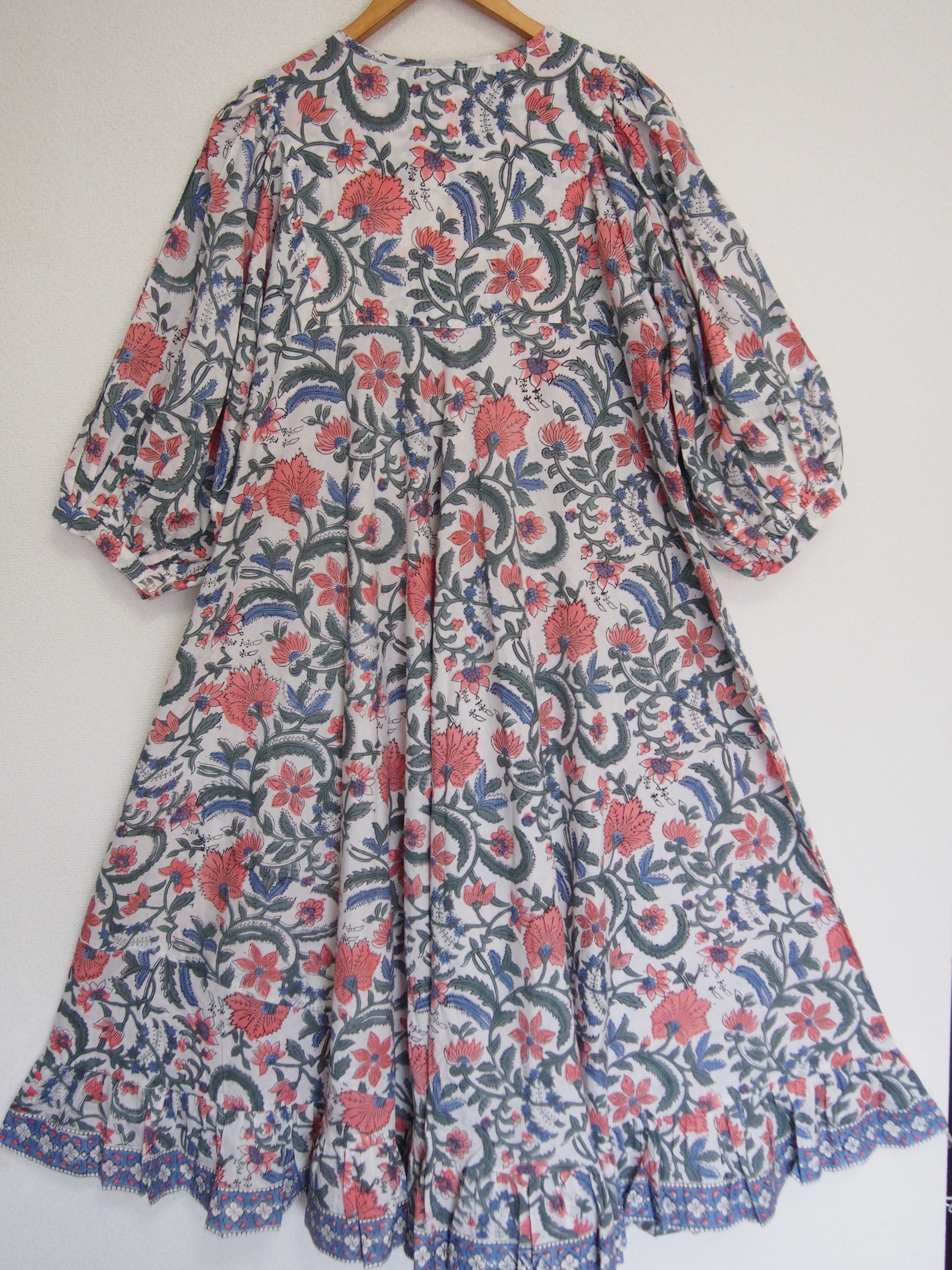 インドの伝統工芸であるハンドブロックプリントで作られたワンピースです。