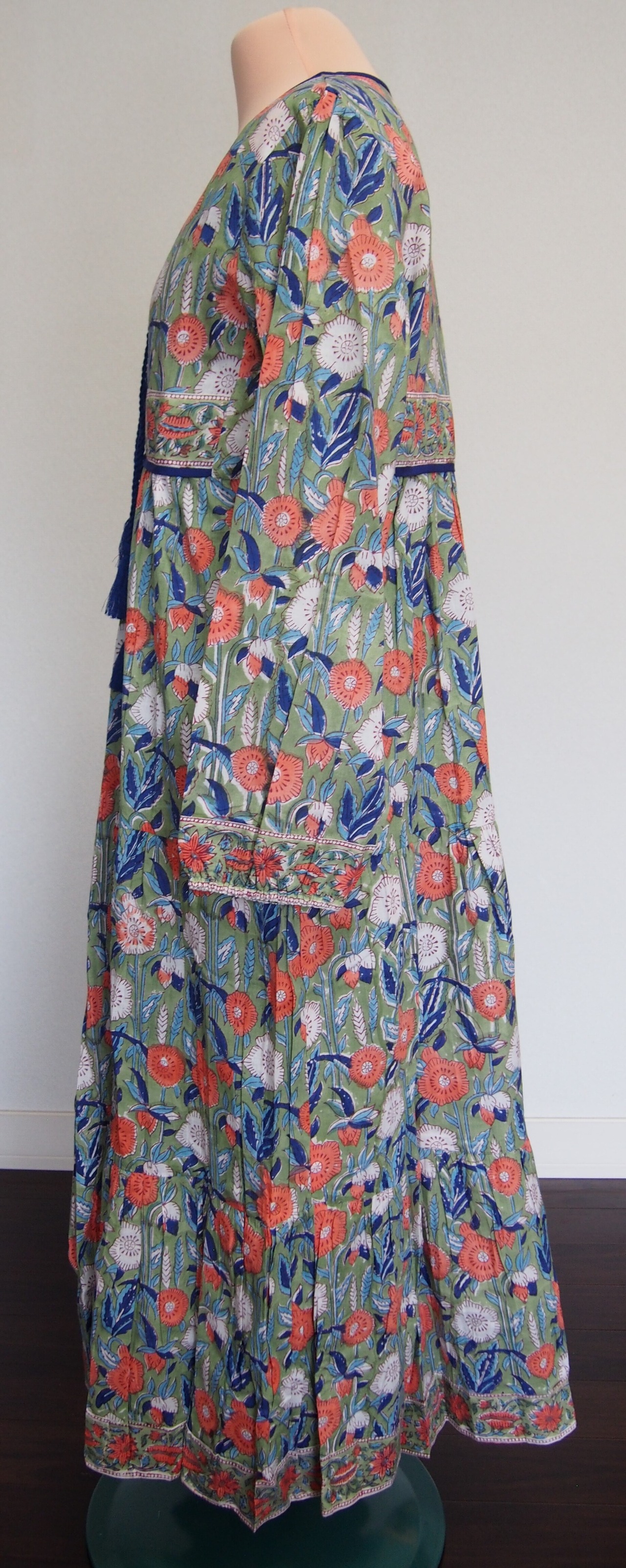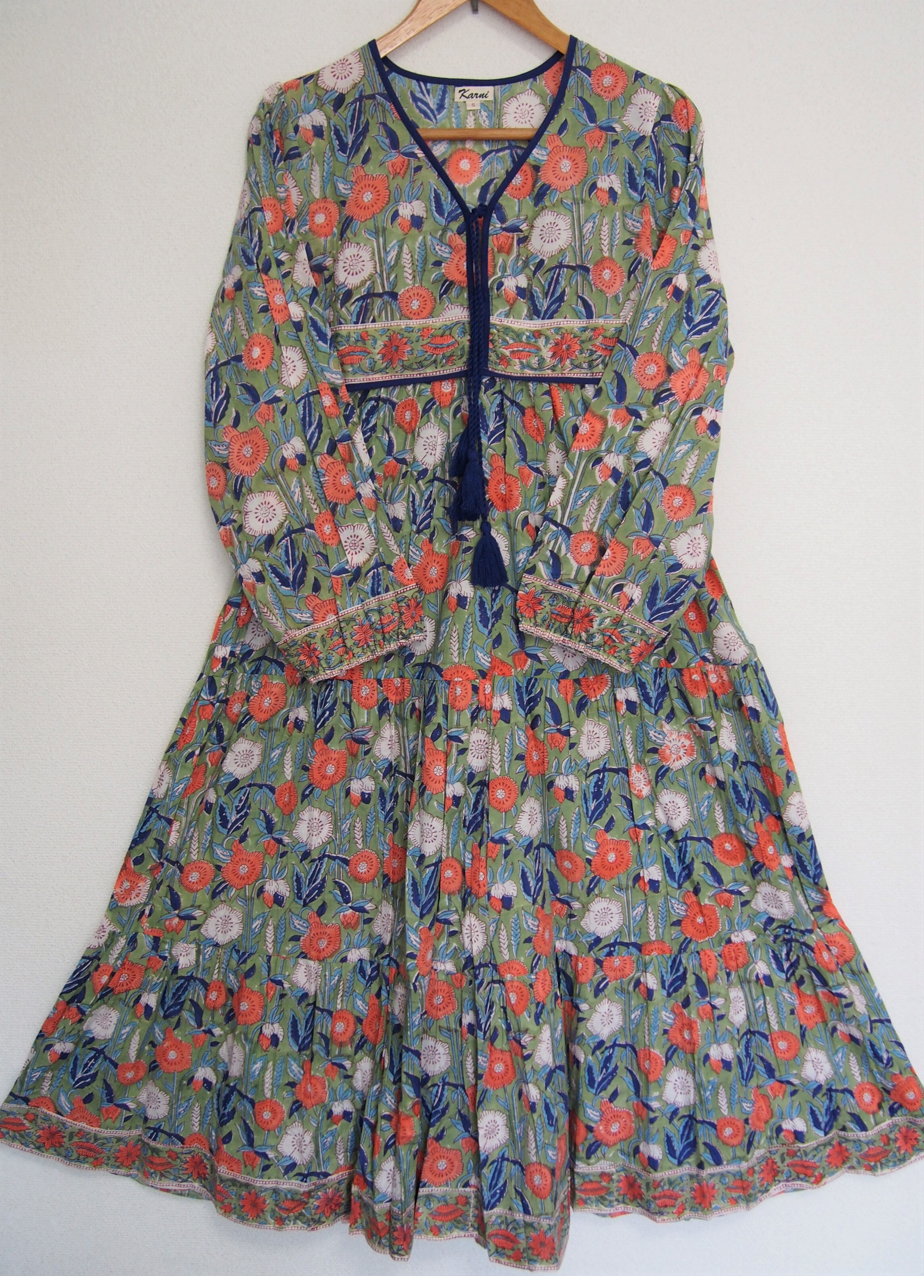 インドの伝統工芸であるハンドブロックプリントで作られたワンピースです。