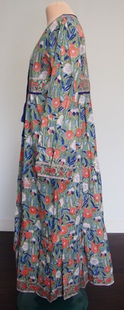 木版でスタンプのように一押し一押し布に捺印して模様を染める染色技法で作られた生地でワンピースが作ってあります。
