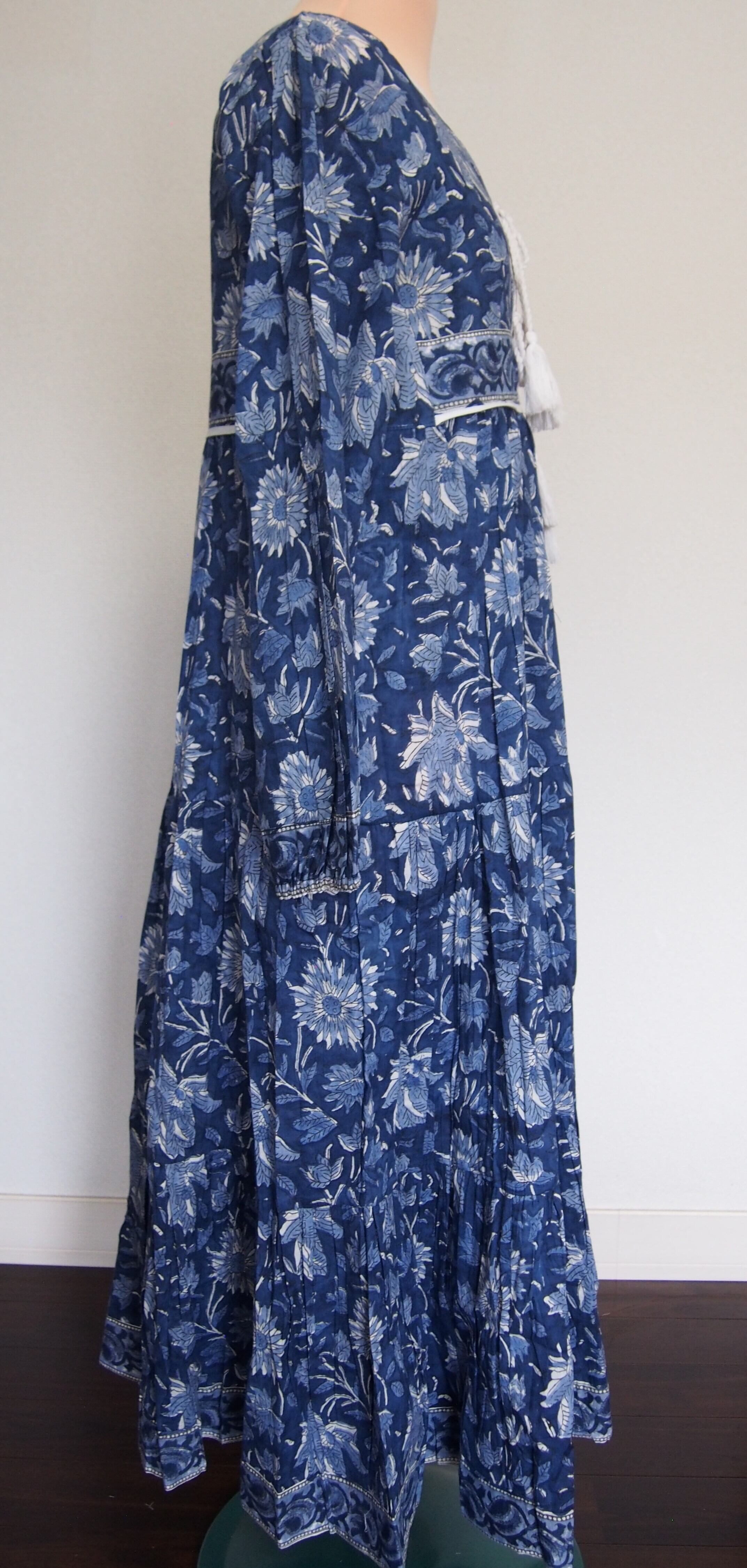 インドの伝統工芸であるハンドブロックプリントで作られたワンピースです。